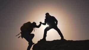 Travel,Bonding,,Friend,Gives,Hand,On,Rock.,Nature,Trek,,Travel